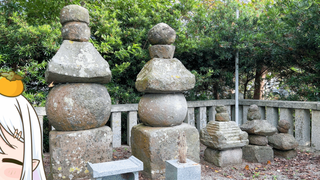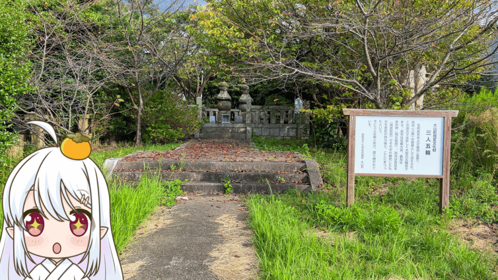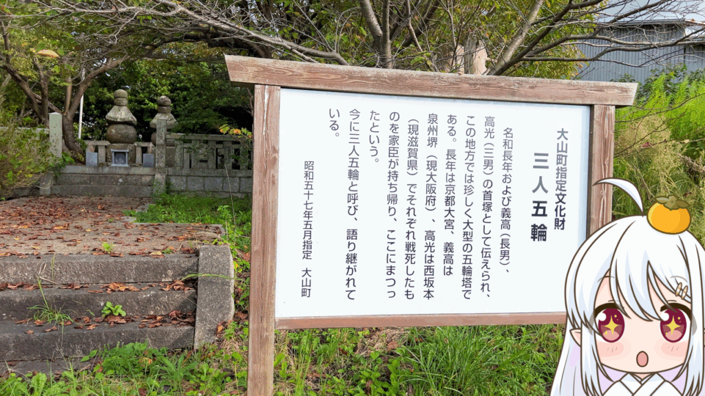 その後、戦い敗れた「名和長年」さんとその長男「義高」さん、三男「高光」さんを家臣が持ち帰り、埋めたと伝えられている首塚なんですよ〜