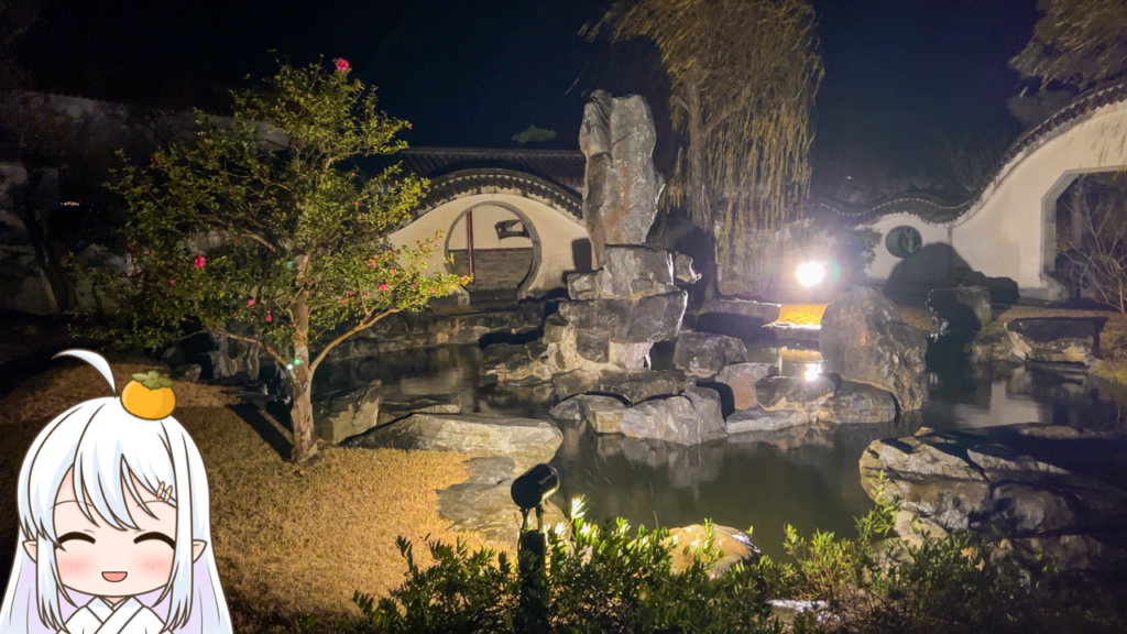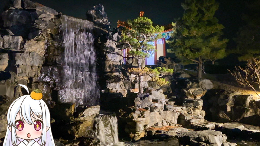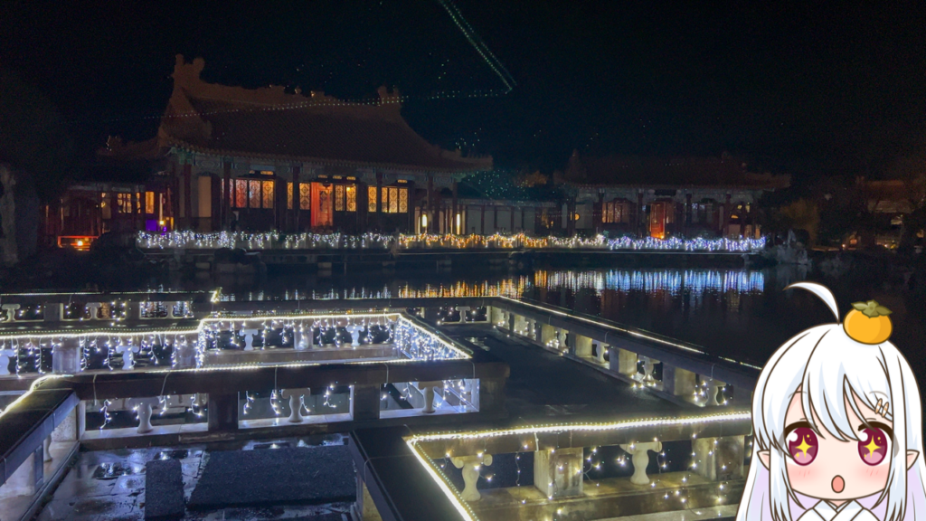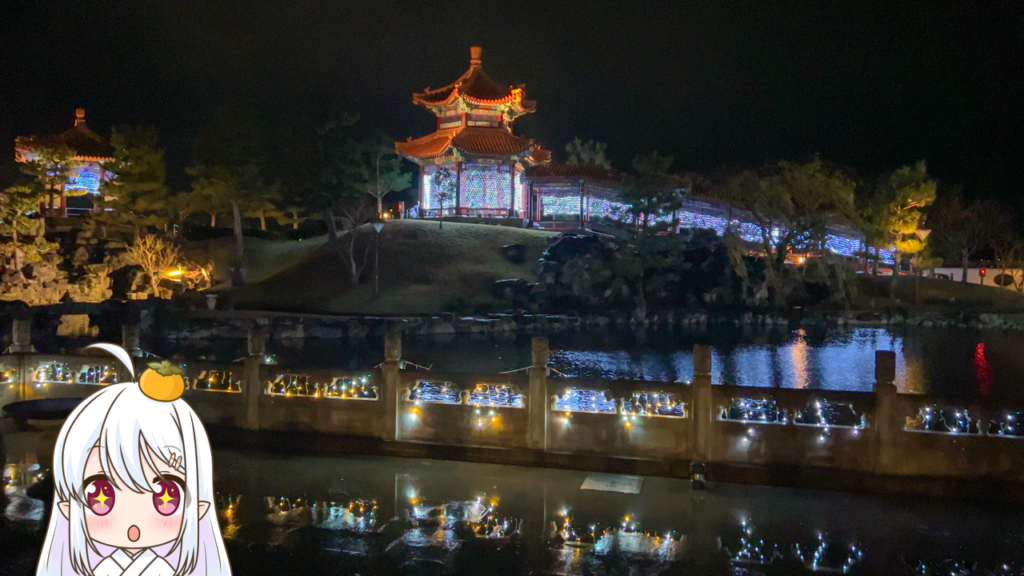 庭園内を様々な灯りが彩り、水面に反射する光も合わさって幻想的な雰囲気にっ
