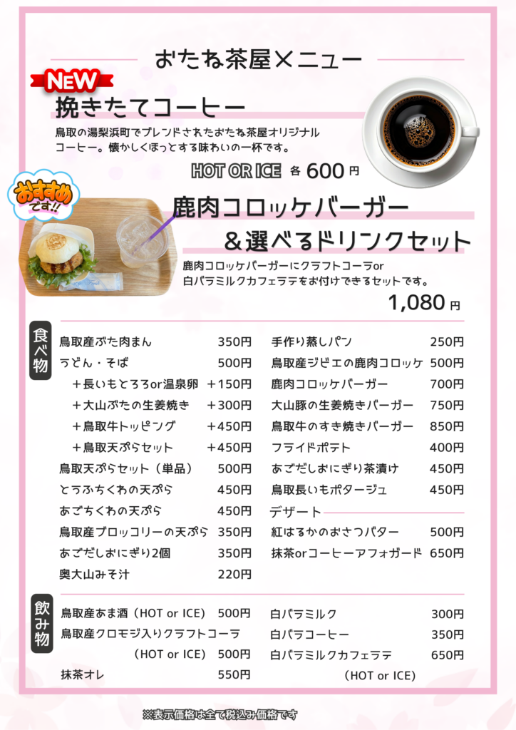 そして「湯梨浜町」の「RestCoffee」さんにブレンドしていただいた、「おたね茶屋オリジナルブレンド」のコーヒーも新メニューに加わりますよ〜